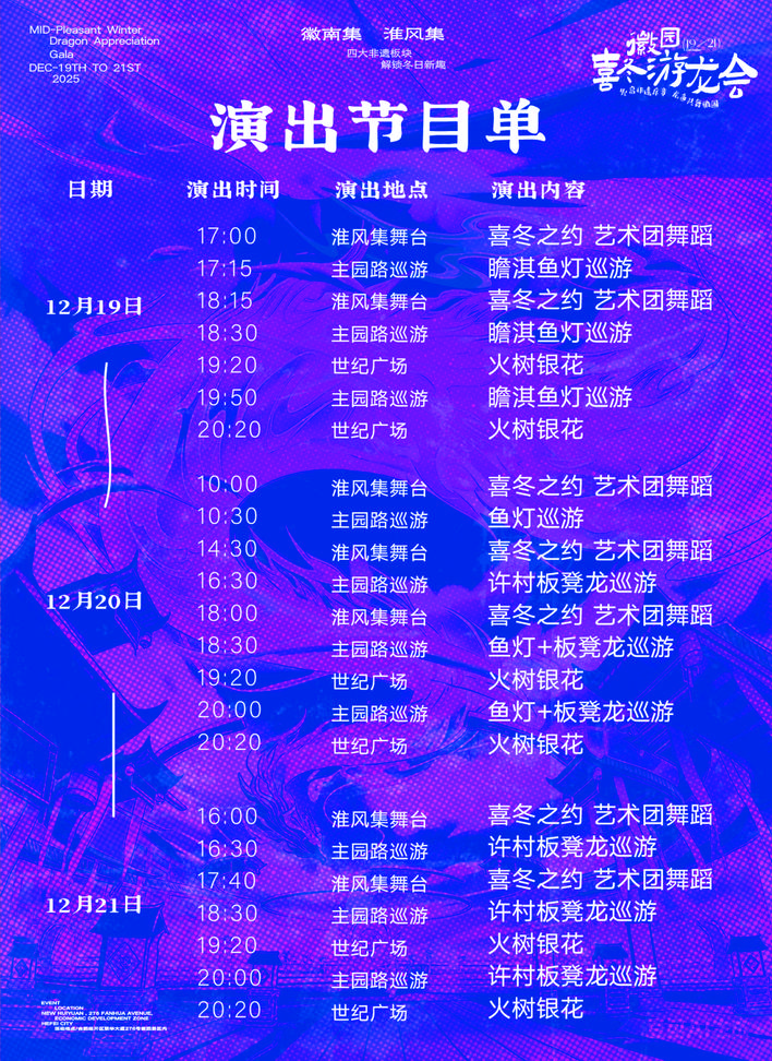 非物质文化遗产板凳龙遇气鱼灯合肥汇源风景区“欢乐冬龙巡游”演出节目即将开启。合肥汇源景区记者昨日获悉,为推动非遗活态传承和创新发展,丰富群众冬季精神文化生活,合肥汇源景区“冬龙巡游”非遗主题文化活动将于12月19日至2日在景区举办。本次活动以皖南特色非遗为核心,呈现一场传统魅力与季节活力相结合的文化盛宴。对于公民和游客。本次活动的主要亮点集中在皖南两大经典非遗同台表演——徽州许村板凳龙与战旗鱼灯齐头并进,再现了皖南两地经典非物质文化遗产的同台表演。几千年的民俗风情。来自黄山市的许村板凳龙以百米长龙的磅礴气势旋转,承载着风调雨顺、繁荣昌盛的美好愿望,展现了传统民俗的深厚底蕴;来自歙县的展旗鱼灯以其精致灵动的造型和独特的“四戏”舞蹈套路传递着吉祥、富贵的寓意,灵活演绎了水乡非物质文化遗产的生动魅力。近150米长的非物质文化遗产巡游转身前行,璀璨的灯光还原了古典诗词《鱼龙舞一夜》的喜庆场景,让蛰伏千年的皖南民俗在合肥城市空间焕发出新的活力。除主体巡游外,活动还打造多元化非遗体验场景,充分激活文化认知。一场光影秀传统技艺将在露天水域表演,火、树、银、花交织,光、影、水、火交融,给观众带来身临其境的视觉震撼和文化熏陶;美丽的地方特别邀请非物质文化遗产项目代表性传承人,开设造纸、黎排面塑等文化遗产手工艺工作坊,让市民亲身参与传统技艺创作,触摸非物质文化遗产。匠心传承文化遗产工艺;同时打造了原住民风情互动区和非遗主题市场,涵盖传统游戏、非遗项目等,让大家在快乐参与中体验原住民风情的乐趣;同时曝光大量山水主题非物质文化遗产,成为热门打卡地或者公民记录和分享非物质文化遗产之美,传播传统文化。本次“冬龙巡游”遵循文化惠民理念,免费向公众开放。惠源景区相关负责人表示,此次活动旨在打破地域限制,让深藏于徽州大山深处的非物质文化遗产在文德中走出来,走进合肥市公共空间,融入市民日常生活,推动非物质文化遗产在当代社会扎根、延续生命。 (记者夏伟)