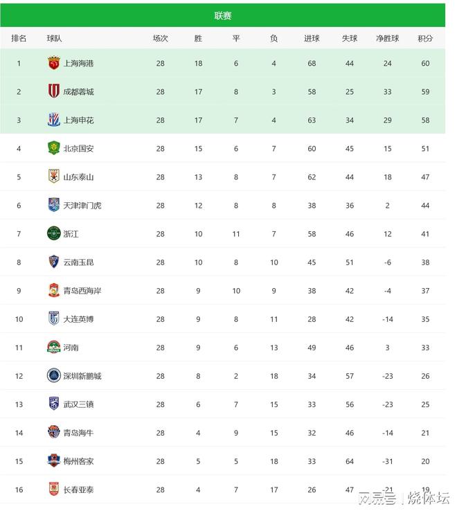 北京时间10月26日晚,2025年中超联赛第28轮剩余四场比赛全部结束。本轮中超联赛,前四名球队均被淘汰。上海海港客场告负,北京国安主场扳回一城,成都与上海申花打平。中超联赛第28轮过后积分榜保持不变,争夺冠军的三支球队均未能获胜。目前,冠军争夺的领先优势仍然掌握在上海海港手中。接下来,海钢将对阵浙江队和大连英博。如果他们赢得两场比赛,他们将被宣布为冠军。本轮上海港首轮失利,失去了冠军的控制权。然而,成都却未能抓住机遇。目前,成都落后上海港一分。成都荣成队还将对阵河南队和深圳新鹏城队。即使他们能赢两场比赛,这也将取决于还有Kaito的表现。上海海港和成都榕城连续丢球,给了上海申花追赶的机会。遗憾的是,上海申花未能拿到三分。上海申花还将对阵深圳西鹏城和天津金门虎,他们夺冠的希望越来越渺茫。此外,青岛海宇本场比赛击败北京国安,积3分,脱离降级区,积分榜升至第14位。降级球队的形势依然十分复杂,悬念可以留到最后一刻。青岛海牛与武汉三阵接下来的一战,将是一场生死之战。北京国安2-4青岛海牛 北京国安本赛季在北京工人体育场进行比赛。第20分钟,法比奥进球取得领先。第56分钟,萨里奇主罚点球,海牛扳平比分。随后,第59分钟,塞尔吉尼奥破门北京国安再次取得领先。不过,萨里奇在第86分钟梅开二度,威灵顿席尔瓦在第90分钟和第1分钟进球,沙里奇在第90分钟和第7分钟也进球。上海申花2-2大连英博 大连英博做客上海体育场。第25分钟卢卓毅进球取得领先,第39分钟刘卓君进球扩大领先优势。随后第43分钟,申花凭借吴曦的进球扳回一分,随后安德烈·鲁伊斯在第90+10分钟罚进点球扳平比分。大连英博在场上与上海申花打成平手。他们最近5场比赛没有取得连胜,3平2负,继续排名第十。青岛西海岸2-2成都荣成 青岛西海岸 本场比赛在青岛西海岸大学城体育场举行。第30分钟,戴维森进球取得领先。第57分钟,戴维森连进两球扩大领先优势。随后,他们在第68分钟凭借费利佩的进球缩小了差距,后者还在第90分钟和第10分钟打进了完美的扳平比分。成都近4场比赛1胜3平。青岛西海岸还没有连续夺冠,想要争夺冠军确实很困难。山东泰山3-1上海港 此役上海港做客济南奥体中心体育场,取得开门红。第9分钟,李兴山进球取得领先。随后卡扎什维利在第41分钟扳平比分,第62分钟刘岩的进球取得领先,第77分钟卡扎什维利的精彩进球扩大了领先优势。山东泰山在卡萨击败上海海港。