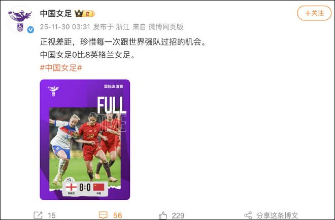 △点击上图查看详情。凌晨 1:30北京时间11月30日,2025年足球友谊赛在温布利球场拉开帷幕。中国女足作为客队对阵英格兰女足。中国女足上半场11分钟内连续丢4球。李梦文用手得分。下半场斯坦威完成帽子戏法。女足在防守区内打得火热。最终,中国女足客场0-8战胜英格兰女足。女足控球率30%,射门6次,射正2次,整场比赛都受到控制。赛后,中国女足官方微博发文:“我们利用一切机会缩小差距,与世界上最好的球队同台竞技。”比赛回顾:网友评价踢球的女孩是最美的,这个差距已经存在很长时间了,关注女足的球迷都知道这一点。不过,教练和球队构成的变化还需要加快。一颗未来之星就这样消失了。把几位临近退役、连训练都没有的球员纳入其中,实在是本末倒置。 Fi_mind_:整场比赛没有防守防守。我真的很想看到更多与世界各地球队的比赛。失败也是一件好事,重复失败可以让你成长。王江s7won:姑娘们,加油。 Fi_mind_:没关系,起床画产品而不是睡觉。姑娘们加油!提高我们的体力和力量。高欣怡点评 张茜 王晨宇 城石互动/城市快报 总报告编辑